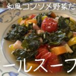 栄養価の高いケールと、免疫力を高める緑黄色野菜の具だくさんスープ。茅乃舎の『野菜だし』を使うと、コンソメより優しい味でお腹いっぱい食べられる!
