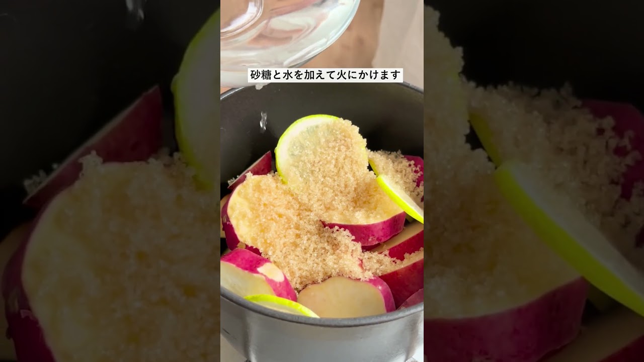 2)鍋にさつまいもとりんごを重ね入れ、
